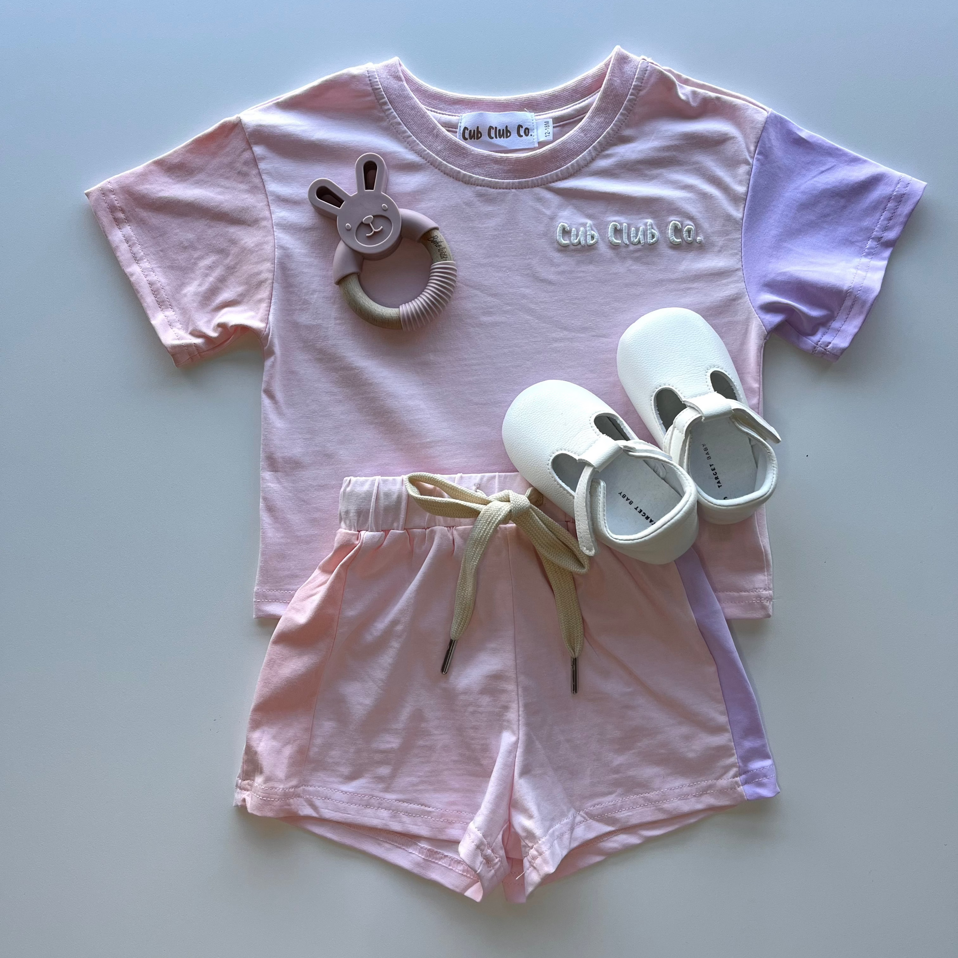 Our Everyday Set in Pink adds a playful twist to your little cub's daily wardrobe. Featuring a soft blush tee with a lilac twist, and matching shorts. This set is made from a lightweight cotton blend designed for all-day comfort and carefree movement. The relaxed fit makes it perfect for playdates, naps, and everything in between- no fuss, just fun.